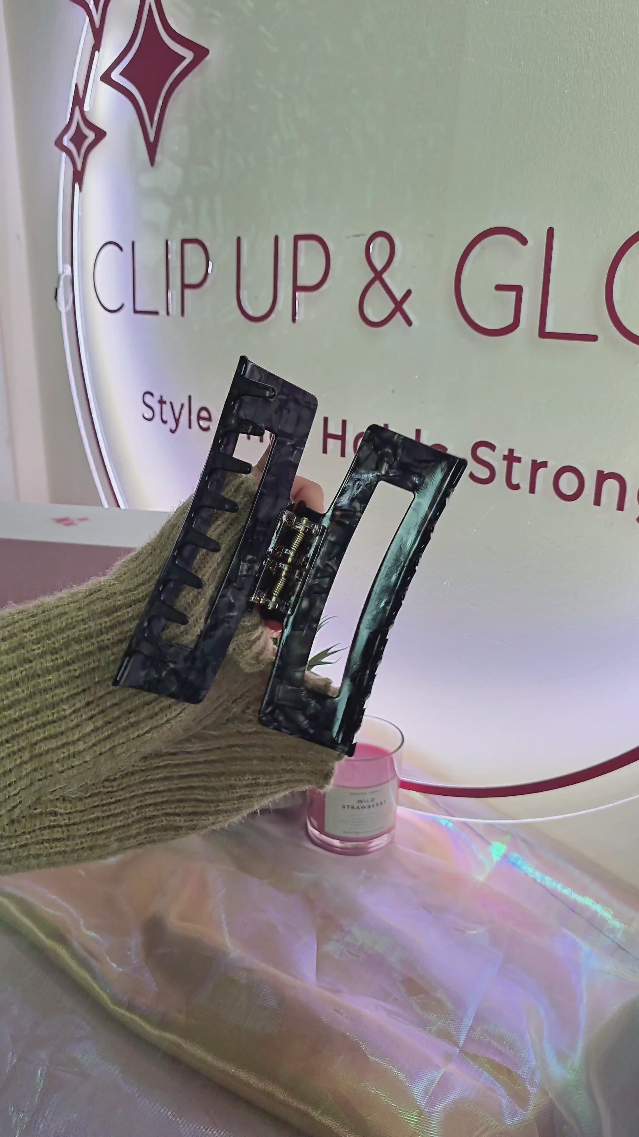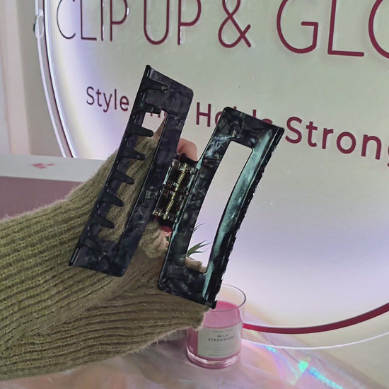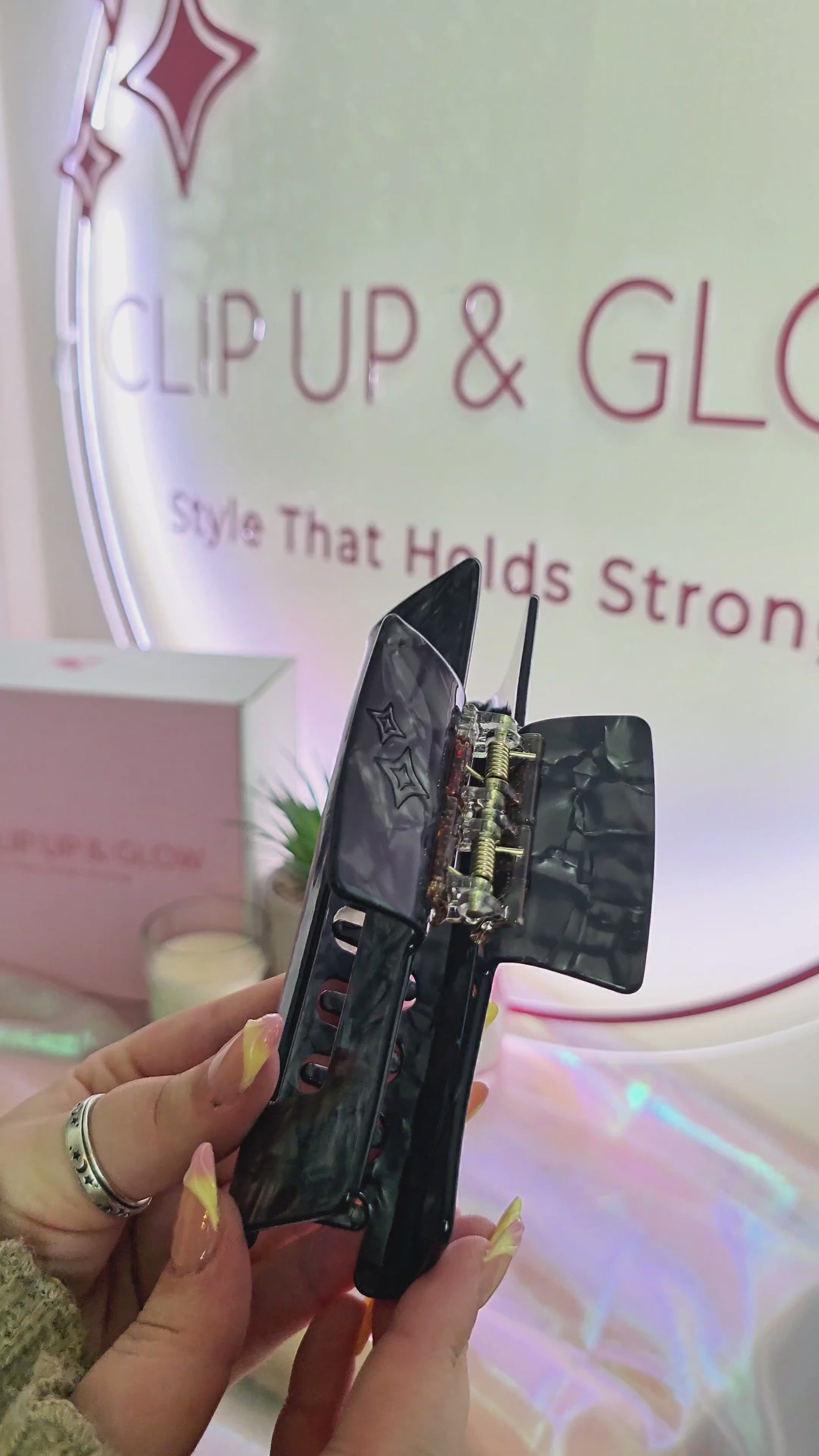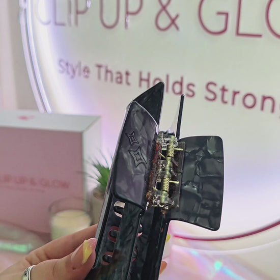 Her metallic black shine radiates a sleek and timeless allure, effortlessly elevating any look and making her your must-have claw clip for every occasion.